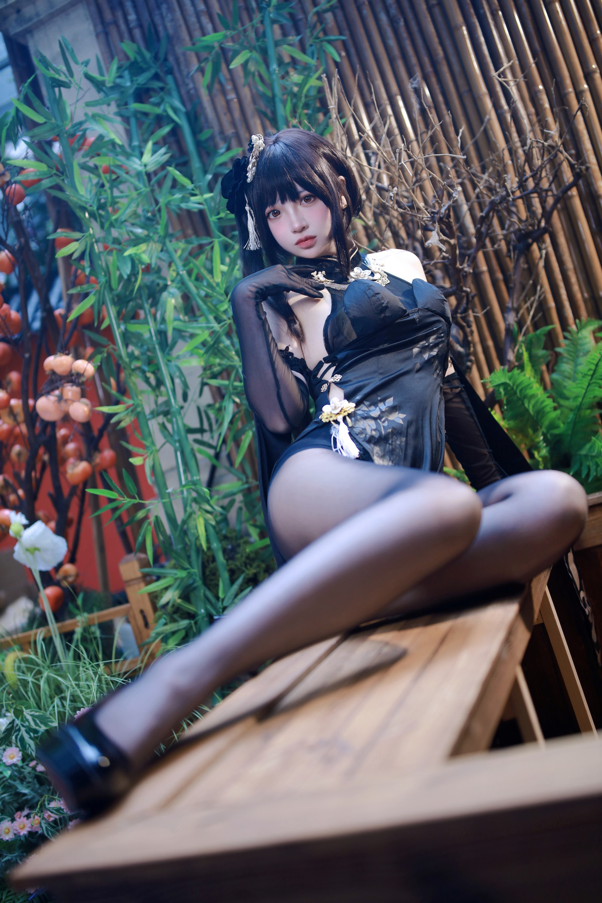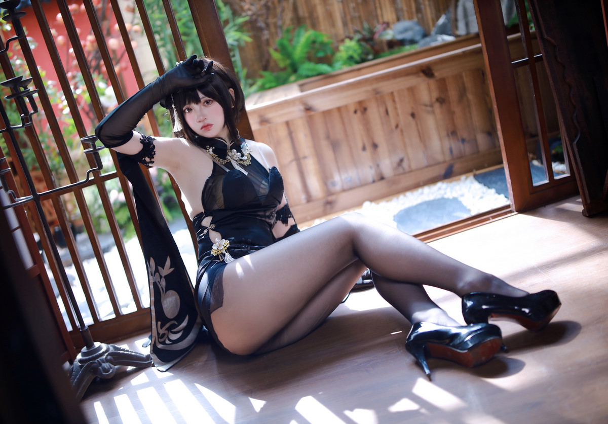 網絡美女瘋貓ss碧藍航線鎮海旗袍主題性感黑色高開旗袍配超薄黑絲秀完美身材誘惑寫真63P