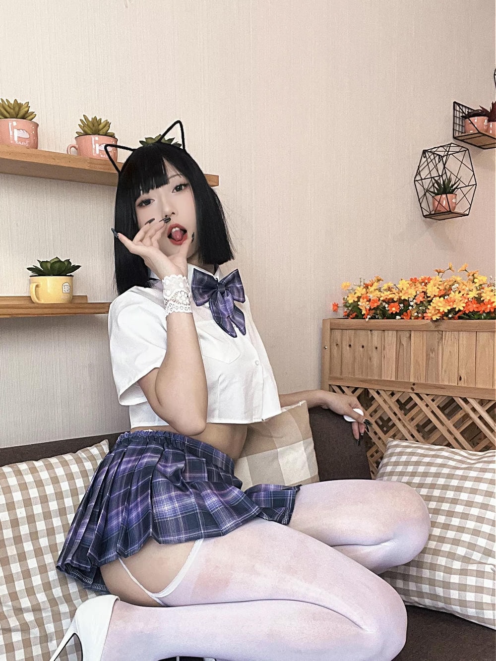 動漫博主Money冷冷JK喵醬主題性感白色短T配JK短裙露白絲吊襪秀翹臀美腿誘惑寫真74P